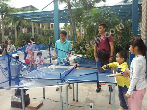 乒乓球機(jī)器人,一款能自動(dòng)發(fā)球的機(jī)器人,通過遙控控制,可調(diào)整發(fā)球的速度以及方向。適合孩子們練習(xí)乒乓球,現(xiàn)場慕名而來的孩子和家長都紛紛圍住,希望能體驗(yàn)一下機(jī)器人打乒乓球有多厲害!